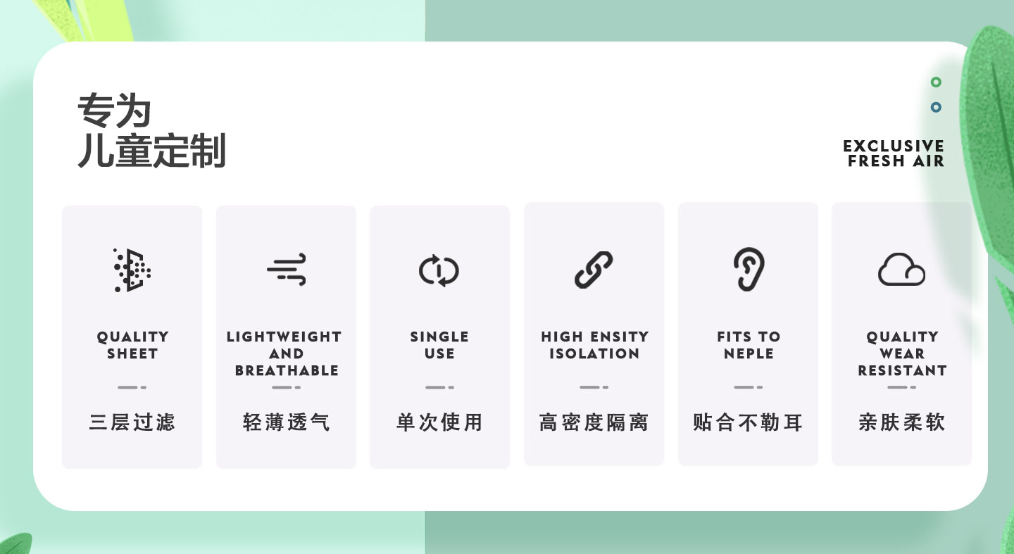 尺寸:14.5x9cm 主要成分:無紡布+熔噴布 產(chǎn)品款式:彈力耳帶 產(chǎn)品特點:過濾效率≥95%/≥98%