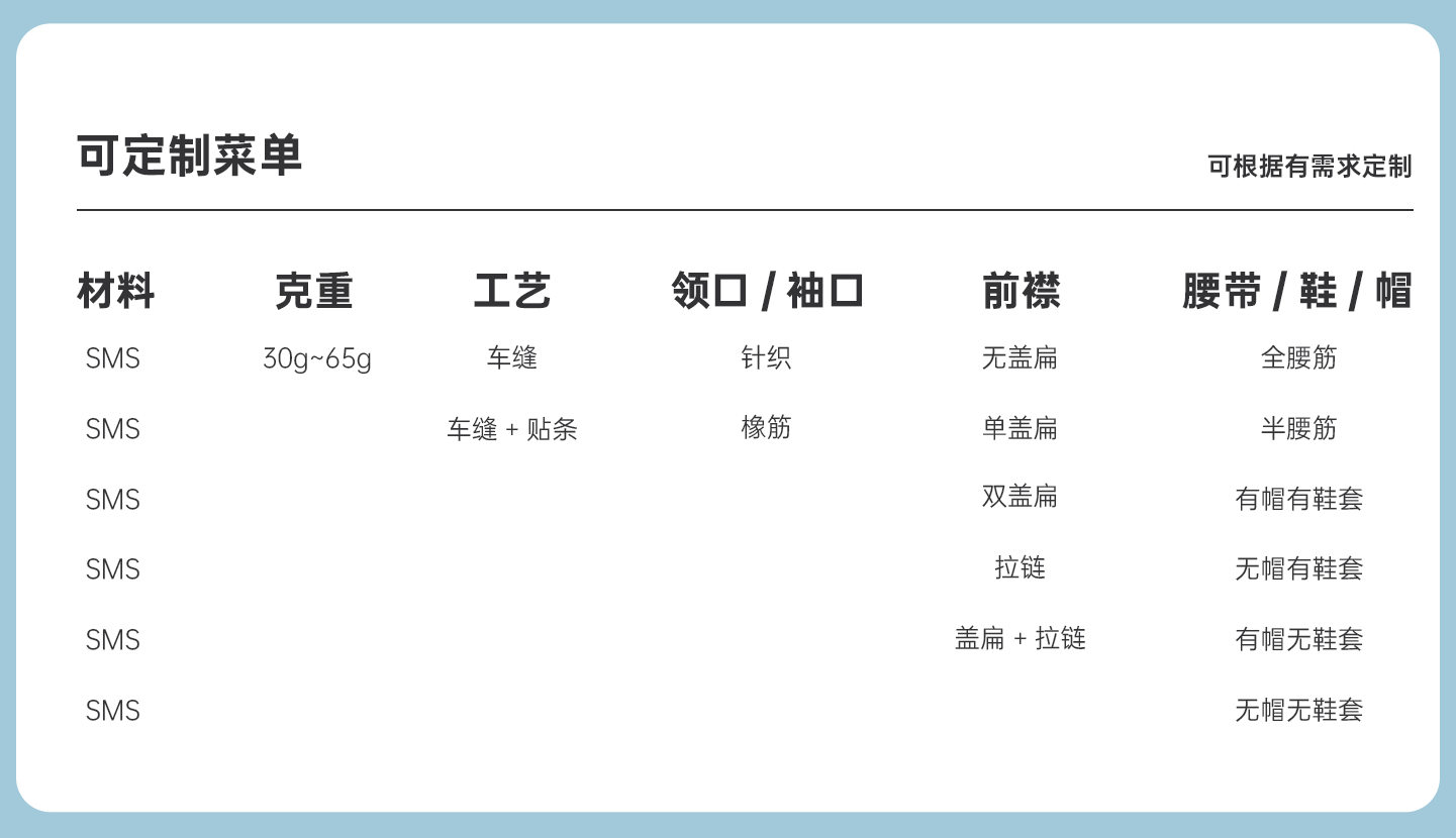 規(guī)格尺寸:S~4XL 主要成分:聚丙烯 克重:48g-65g 工藝:車縫、拉鏈無(wú)蓋扁、有帽無(wú)鞋套 包裝:1件/包 25包/箱