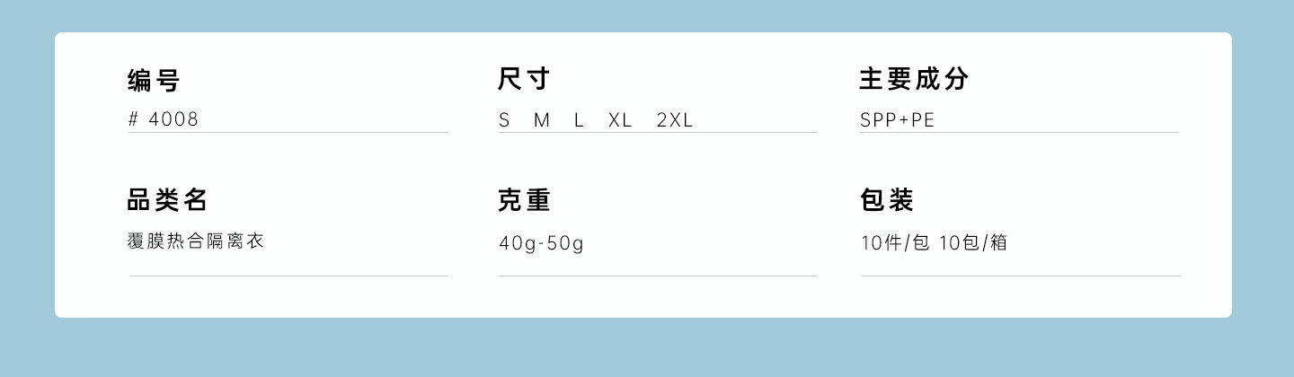 規(guī)格尺寸:S~2XL 主要成分:聚丙烯+聚乙烯 克重:40g-50g 顏色:白色、黃色、藍(lán)色 工藝:熱合、針織袖口領(lǐng)口魔術(shù)貼、點(diǎn)焊腰帶 包裝:10件/包 10包/箱