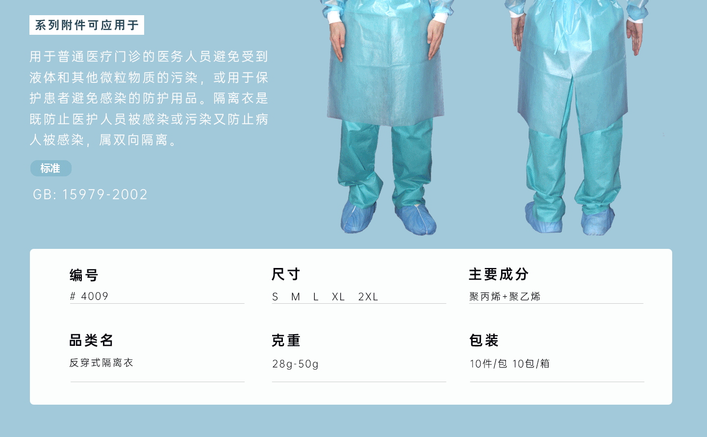 規(guī)格尺寸:S~2XL 主要成分:聚丙烯+聚乙烯 克重:28g-50g 顏色:白色、黃色、藍色 工藝:車縫、針織袖口領口魔術貼、呵腰帶 包裝:10件/包 10包/箱