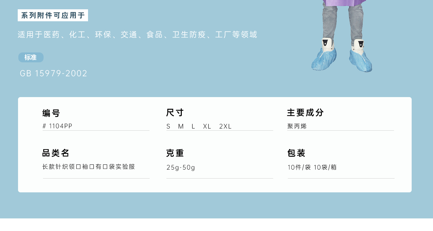 規(guī)格尺寸:S~2XL 主要成分:聚丙烯 克重:25g-50g 顏色:白色、藍(lán)色、深藍(lán)、淺藍(lán)、紫色 工藝:車縫、針織領(lǐng)口、袖口、5扣、三口袋 包裝:10件/袋 10袋/箱