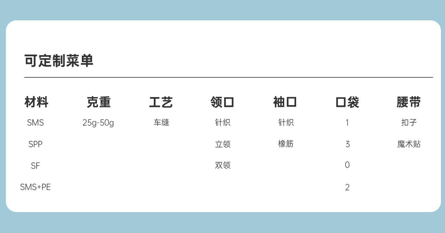 規(guī)格尺寸:S~2XL 主要成分:聚丙烯 克重:25g-50g 顏色:白色、藍色、深藍、淺藍、紫色 工藝:車縫、1口袋、圓領 包裝:10件/袋 6袋/箱